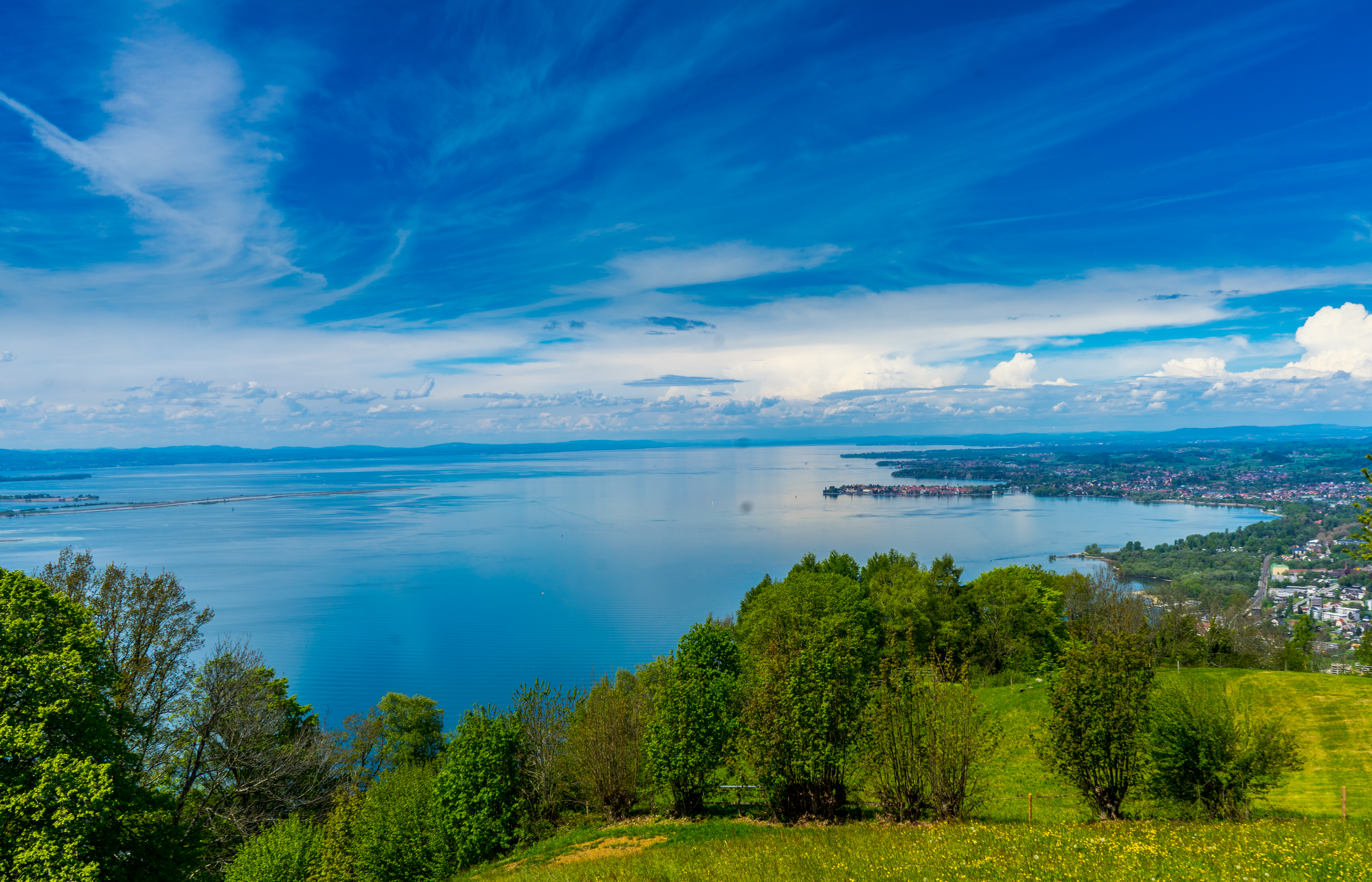 Der Blick aus unseren 32 Zimmern und 8 Freiraum-Chalets gehört zu den schönsten am Bodensee: Lindau, das Allgäu, die Schweizer Alpen – und bei klarem Wetter bis weit in die Ferne. Ein Panorama, das man nicht vergisst – morgens beim Frühstück, abends auf der Terrasse, und überall dazwischen.